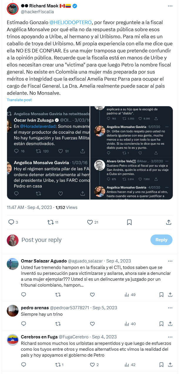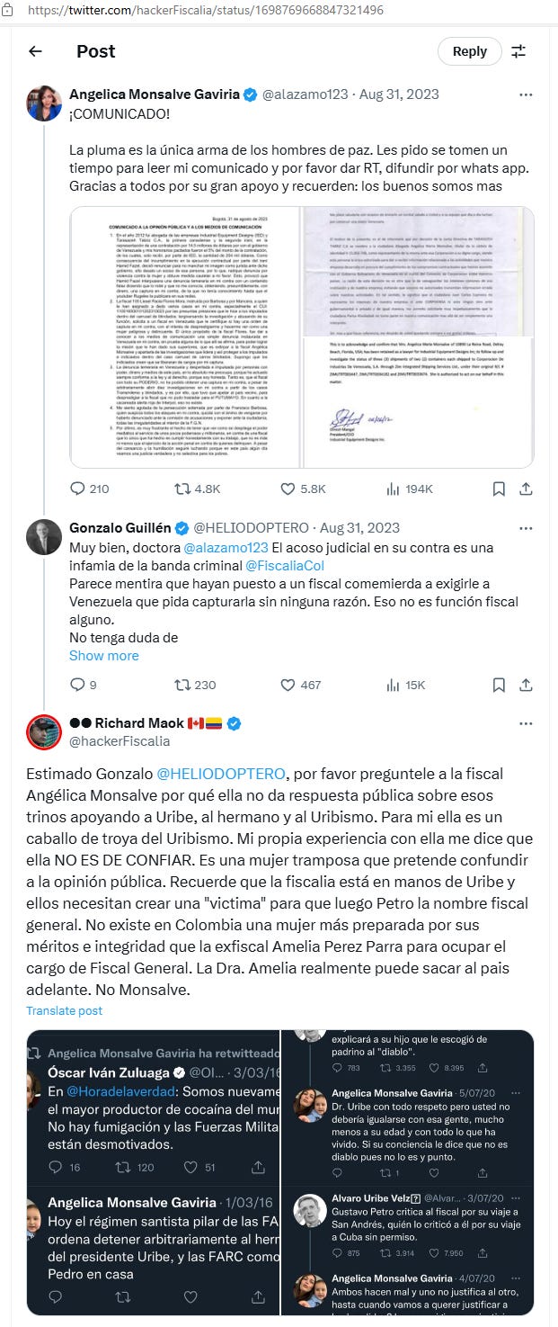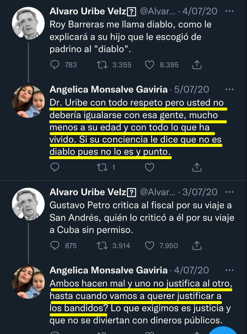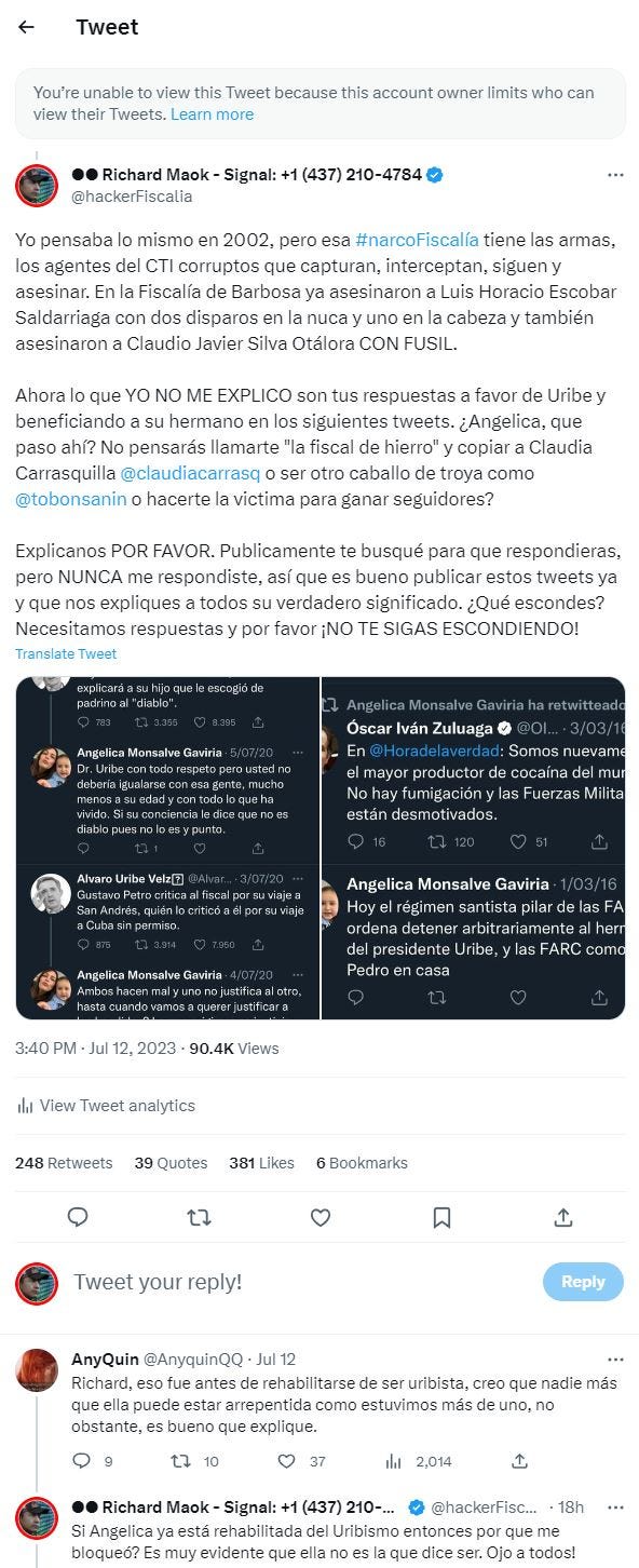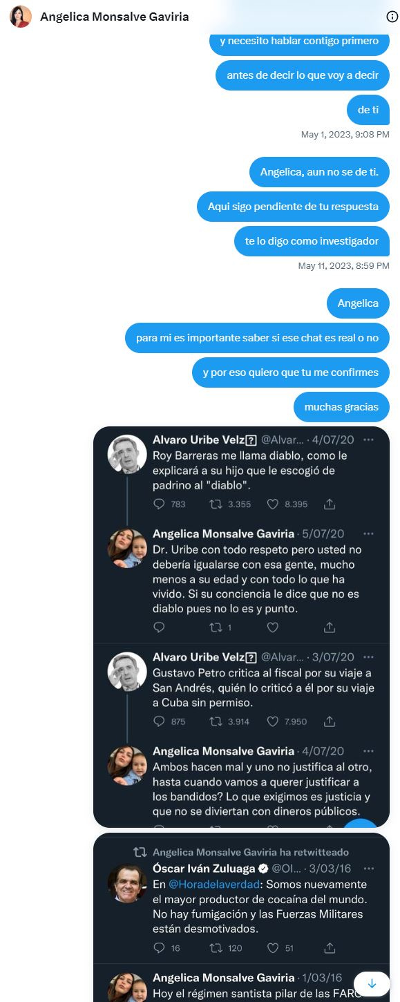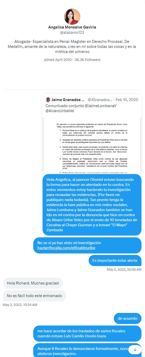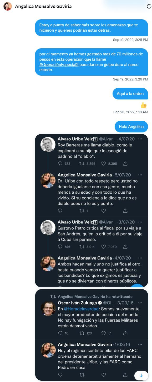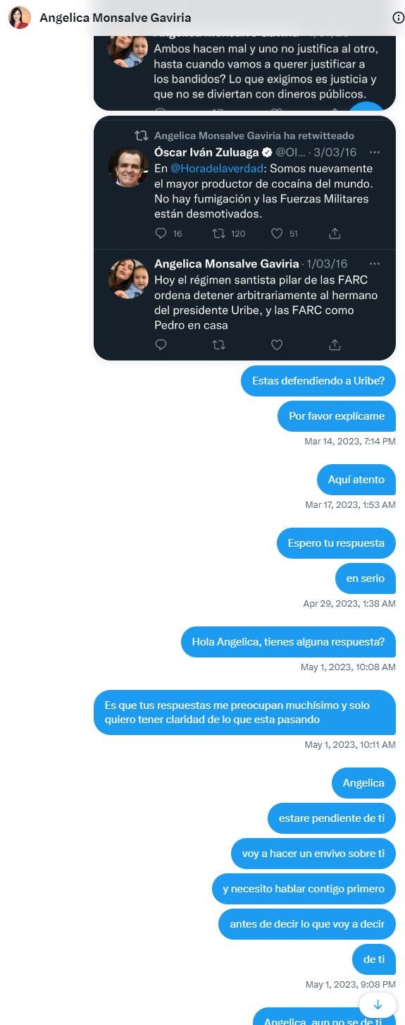 En el caso de Angélica, ella dijo que la querian asesinar, entonces le escribí por X para ser solidario y poder ayudarla, pero al final me escogió como su enemigo. Depronto porque la cogí con las manos en la masa, cuando le pregunté sobre los tweets a favor del uribismo. Nunca respondió y me trato de extorsionador, vean.