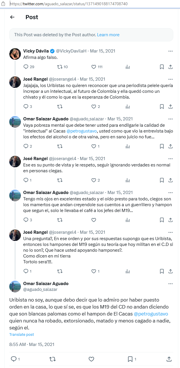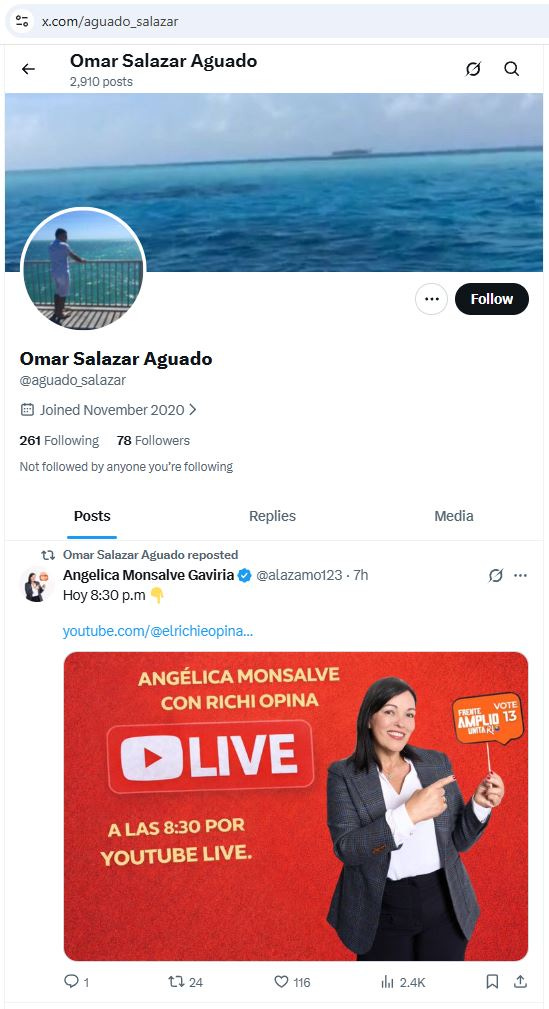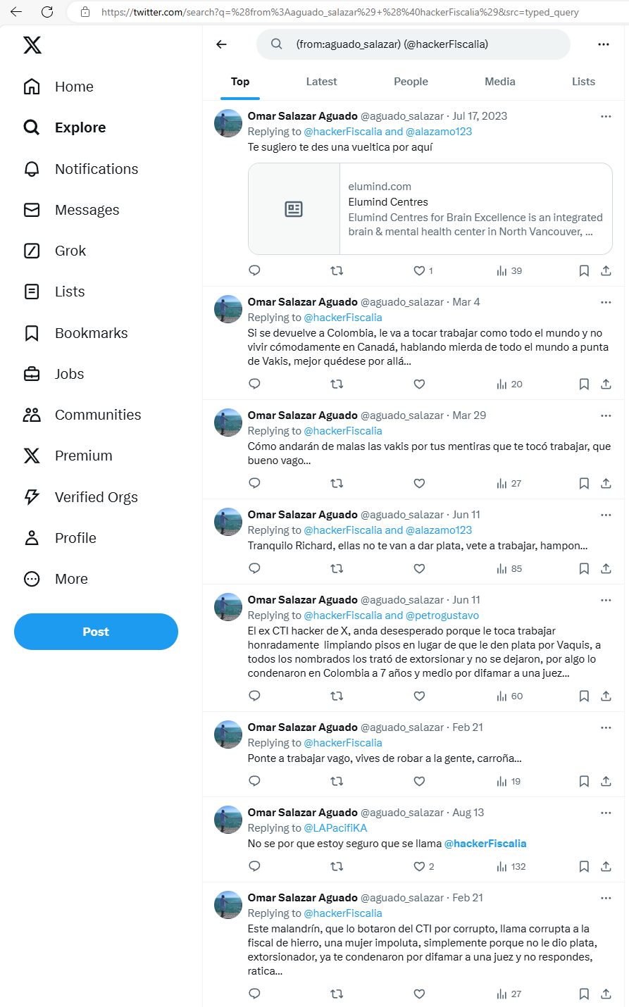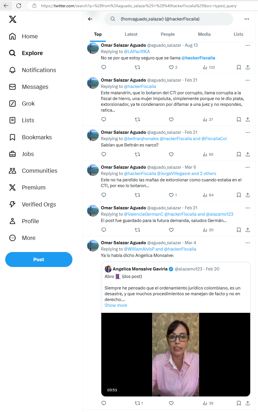 Nunca le escribí al esposo de Angélica Monsalve Gaviria, llamado Omar José Salazar Aguado. Sin embargo, vi que comenzó a atacarme en X y aquí están las capturas de pantalla: