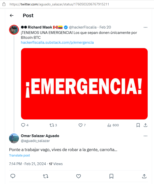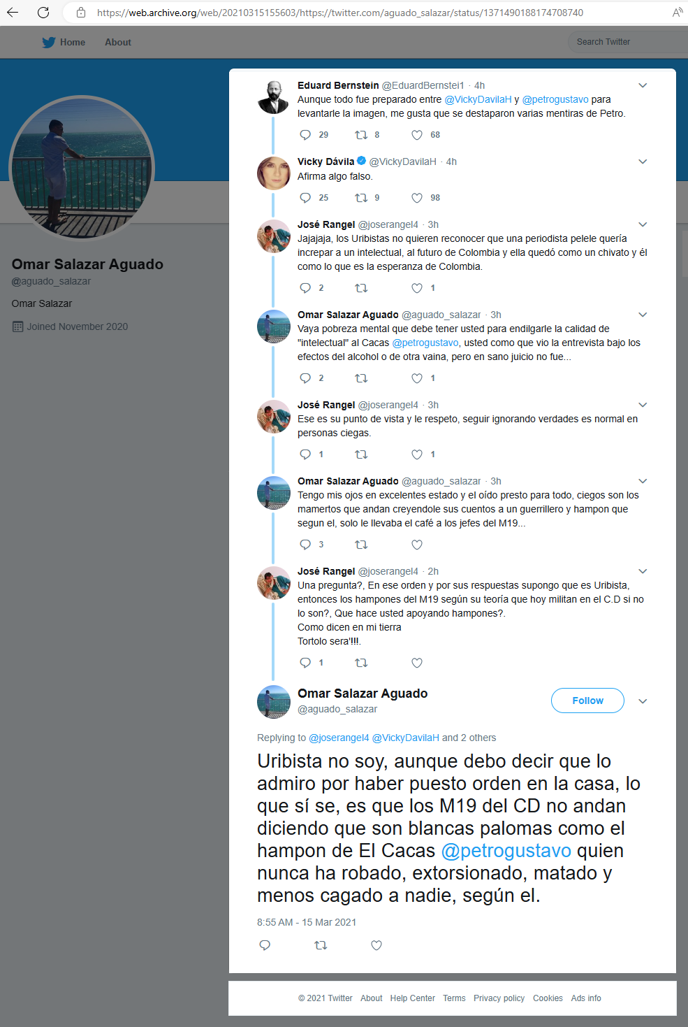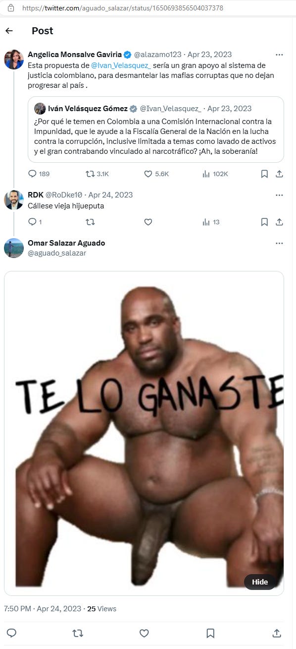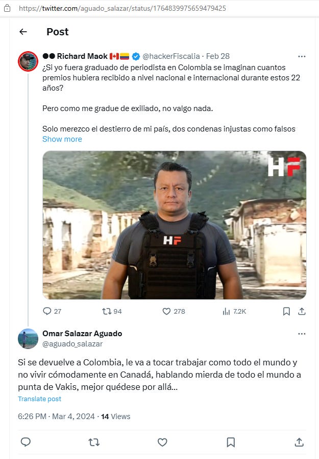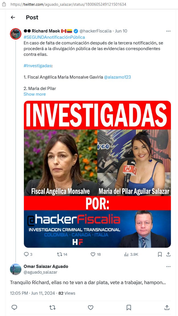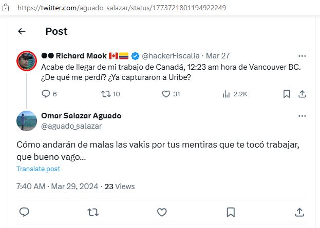 Nunca le escribí al esposo de Angélica Monsalve Gaviria, llamado Omar José Salazar Aguado. Sin embargo, vi que comenzó a atacarme en X y aquí están las capturas de pantalla: