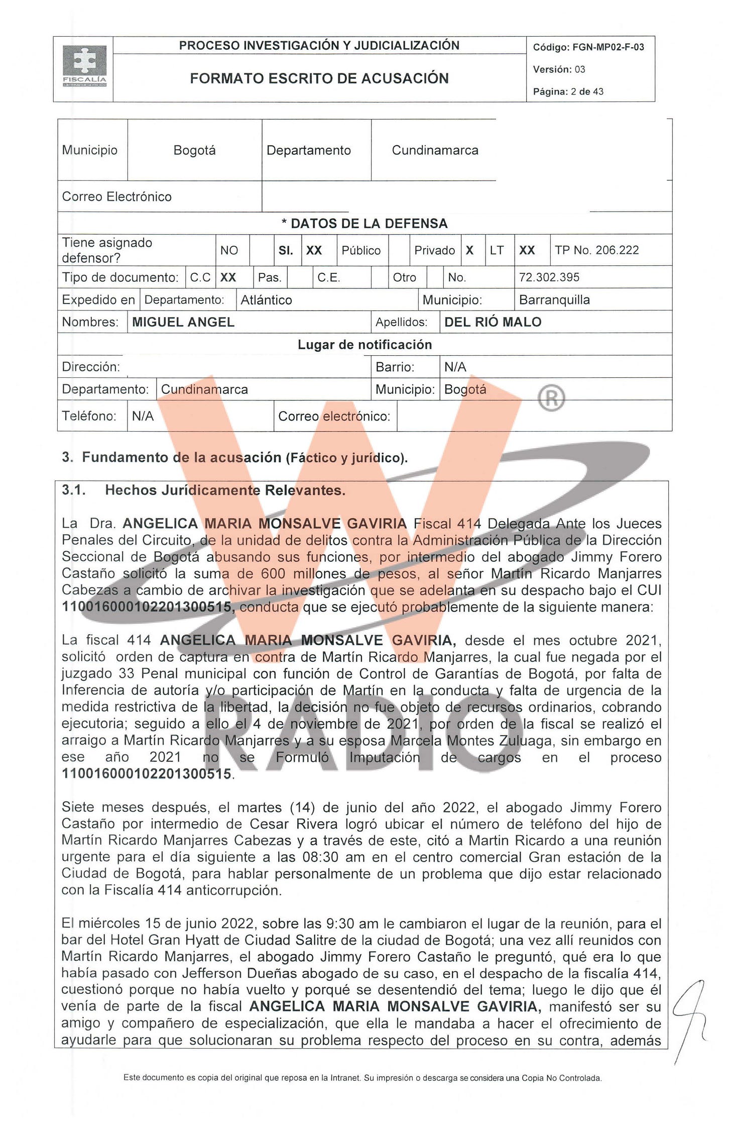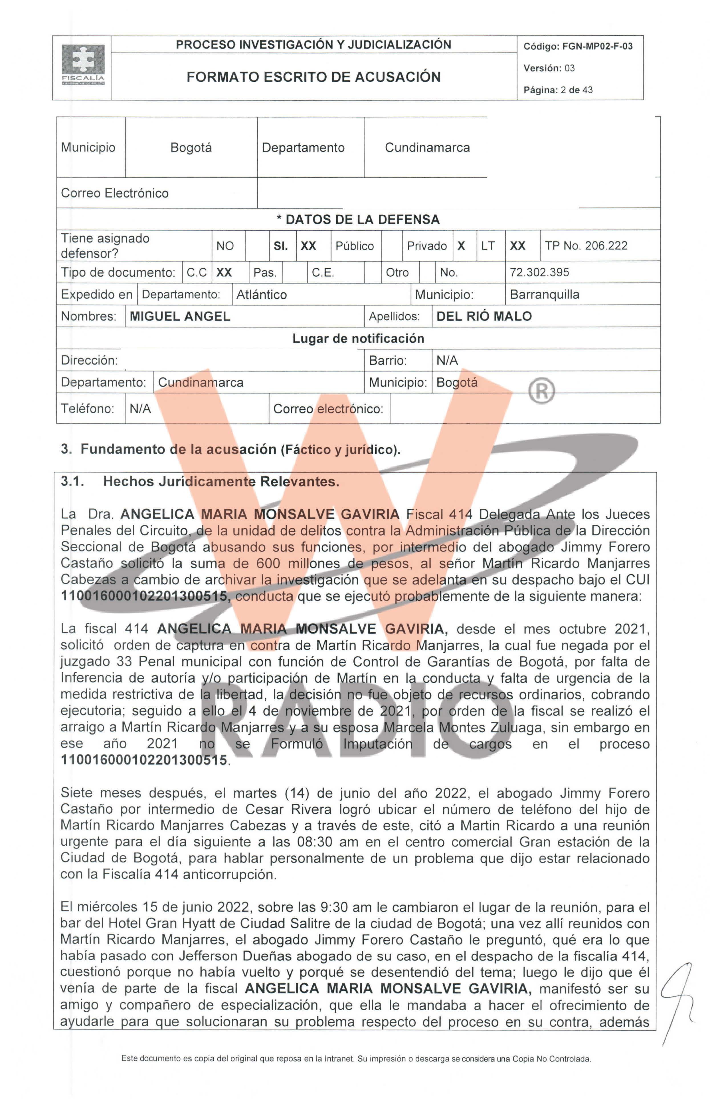 La fiscal colombiana Angélica Monsalve, famosa por denunciar un presunto tráfico de influencias del fiscal general Francisco Barbosa para evitar la imputación de Carlos y Javier Río Velilla, y Felipe Ríos Velilla; es pedida por las autoridades venezolanas. El Ministerio de Relaciones exteriores del vecino país confirmó que desde 2014 hay una orden de aprehensión en contra de Monsalve por los delitos de hurto calificado y estafa, y dicha orden se mantiene vigente.