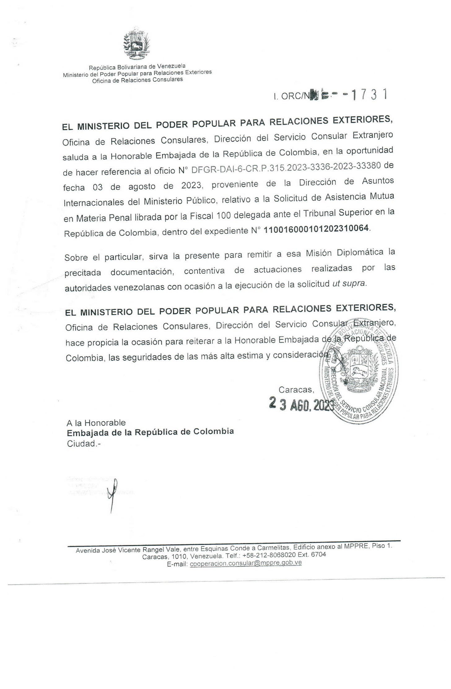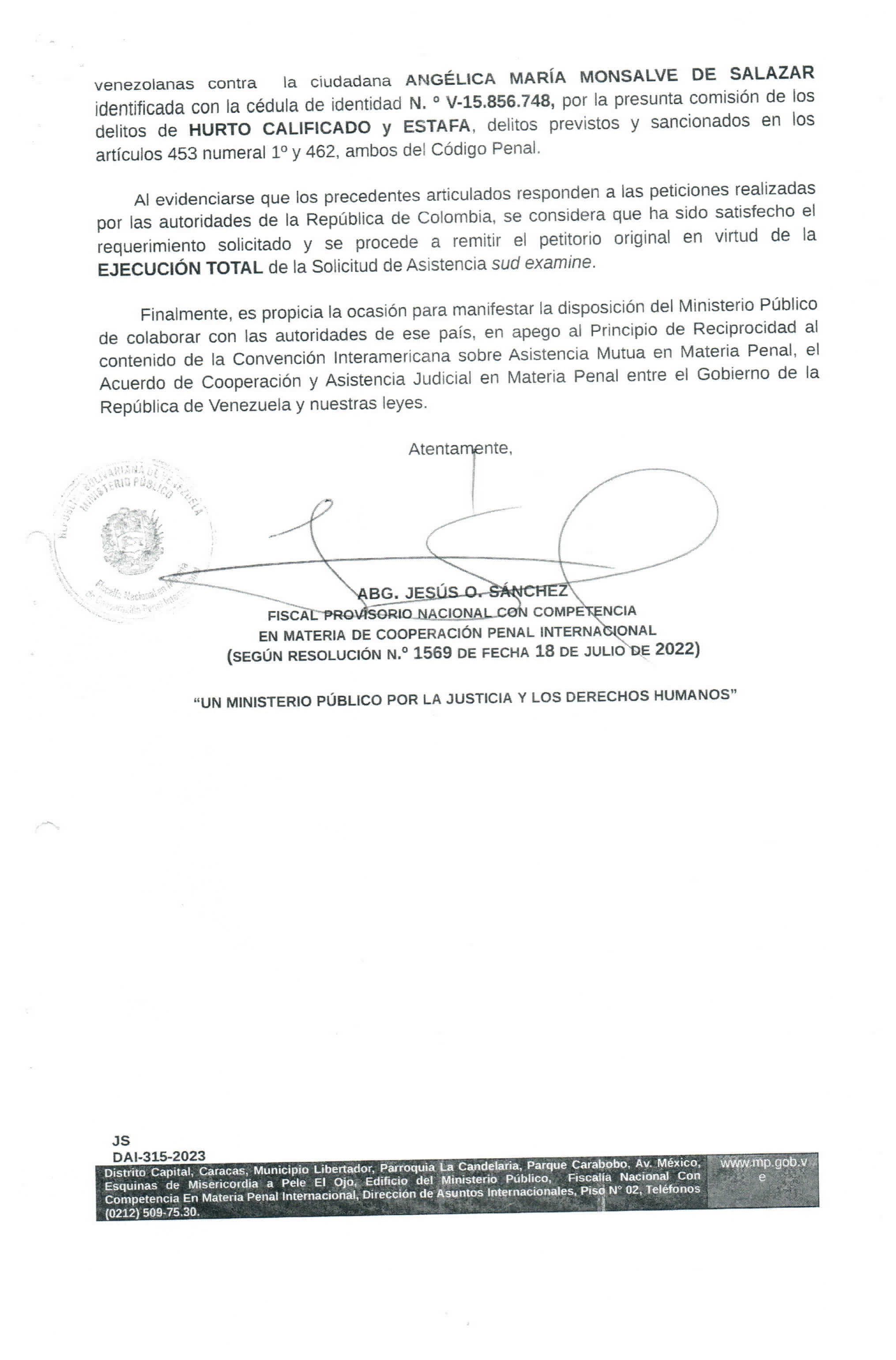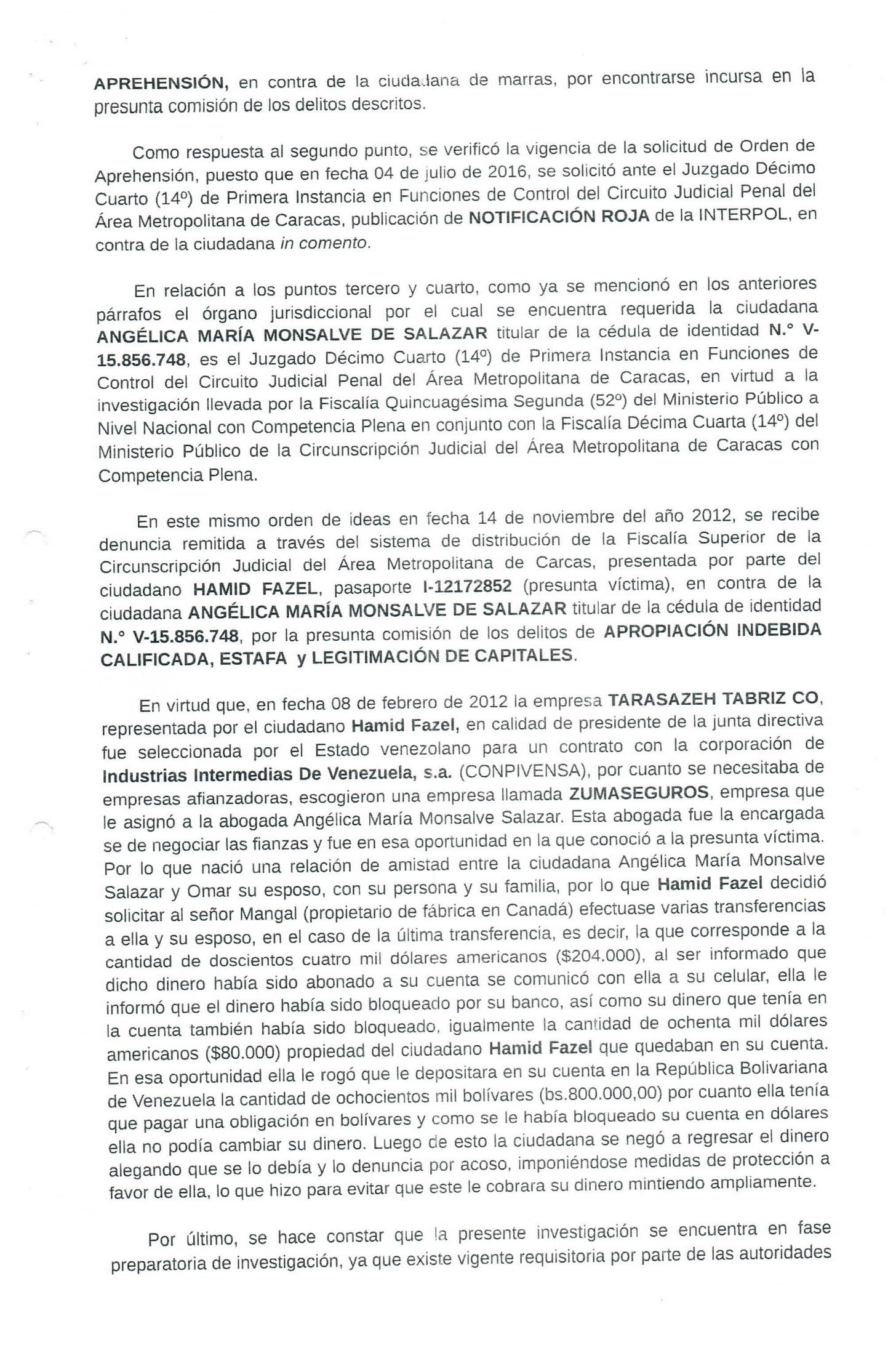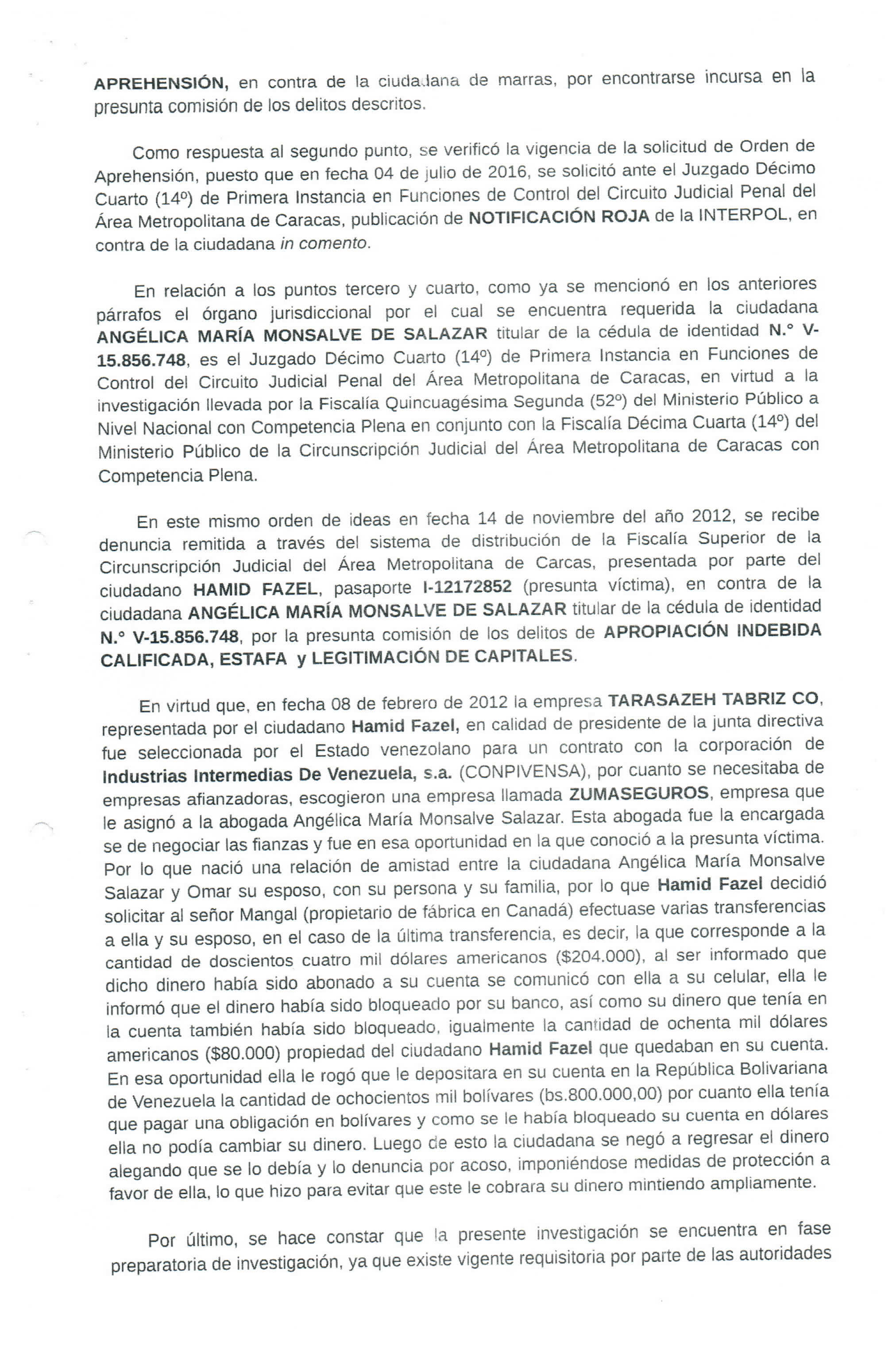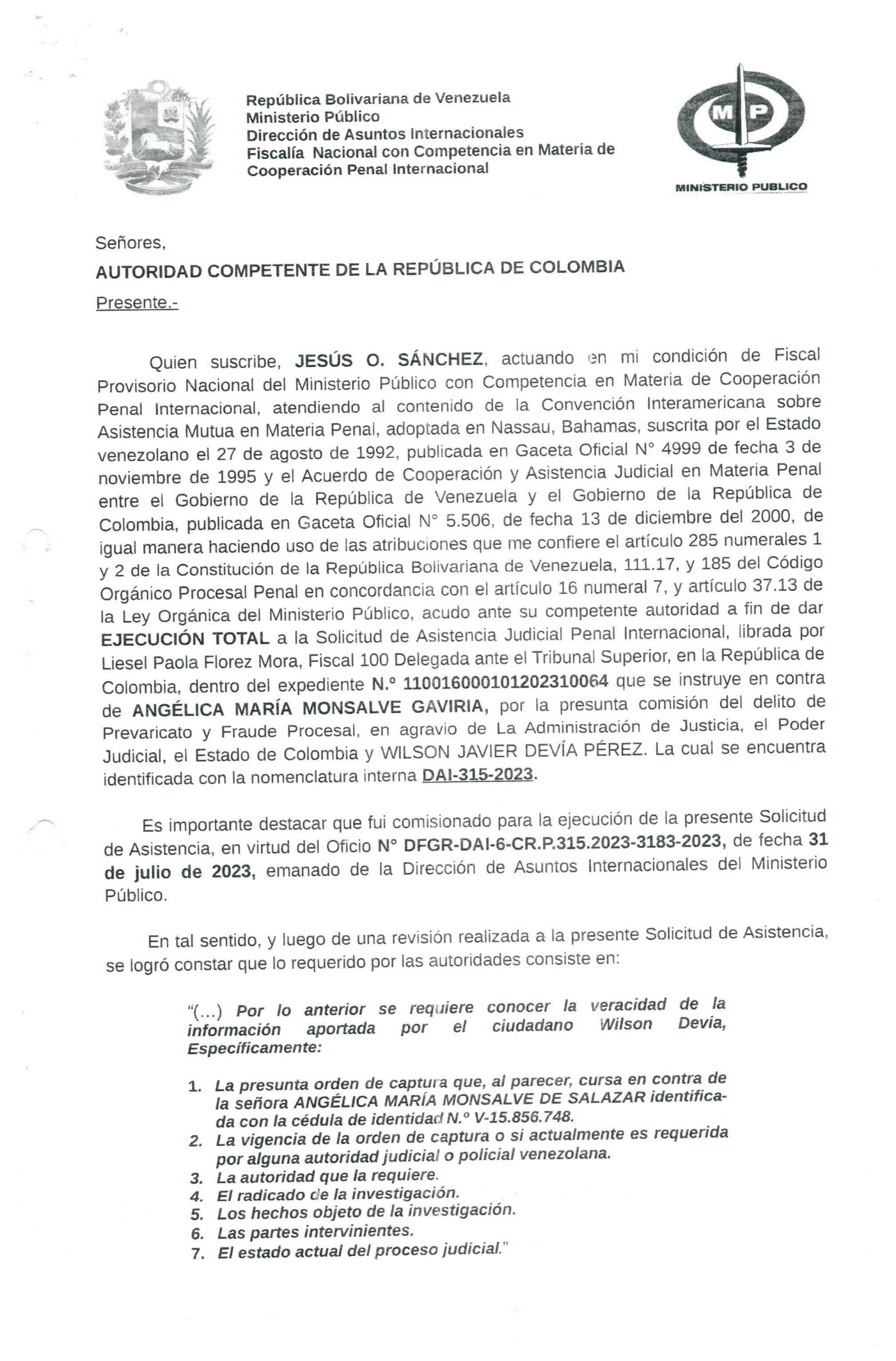 El documento enviado por las autoridades venezolanas es la respuesta a una solicitud hecha por la fiscal 100 delegada ante el Tribunal Superior de Bogotá, Liesel Paola Florez Mora, por una investigación que se adelanta en contra de Monsalve por presunto prevaricato y fraude procesal. Según la respuesta del Ministerio de Relaciones Exteriores de Venezuela, la fiscal Angélica Monsalve y su esposo Omar Salazar, fueron denunciados por el empresario iraní Hamid Fazel.