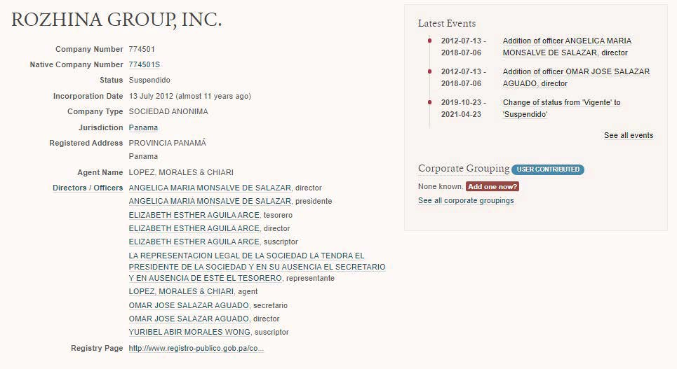 Angélica Monsalve y el esposo Omar José Salazar Aguado aparecen en una empresa de Panamá llamada Rozhina Group Inc. que fue incorporada al registro de Panamá el 13 de julio de 2012 y que fue suspendida el 23 de abril de 2021 por violar el orden legal de Panamá donde es común abrir este tipo de sociedades para blanquear dinero proveniente de delitos y evadir impuestos, ya que Panamá es un paraíso fiscal.