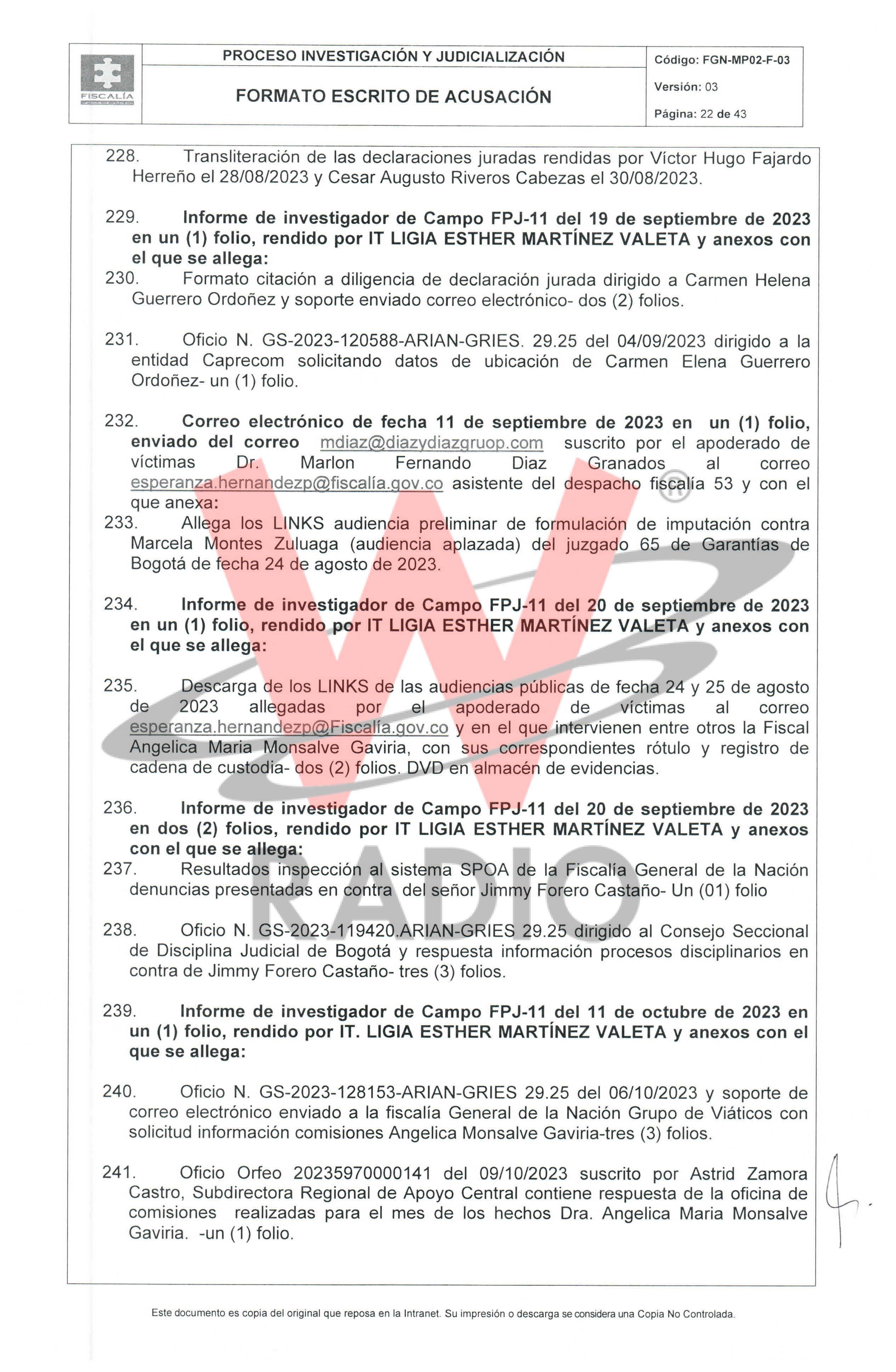 En Colombia está el escrito de acusación de la Fiscalía por el delito de concusión, es decir por soborno al exigir 600 millones de pesos a través del abogado Jimmy Forero Castaño, por no imputar por corrupción en la compra de carros blindados de la UNP a los contratistas Martín Manjarres y a su esposa Marcela Zuluaga. Aunque inicialmente el abogado Miguel Angel del Rio logró defenderla, se recomienda reabrir este proceso, sobre todo porque existe un patrón de conducta cuando hizo negocios con Emilio Tapia de Centros Poblados y luego lo traicionó y se fue en su contra.