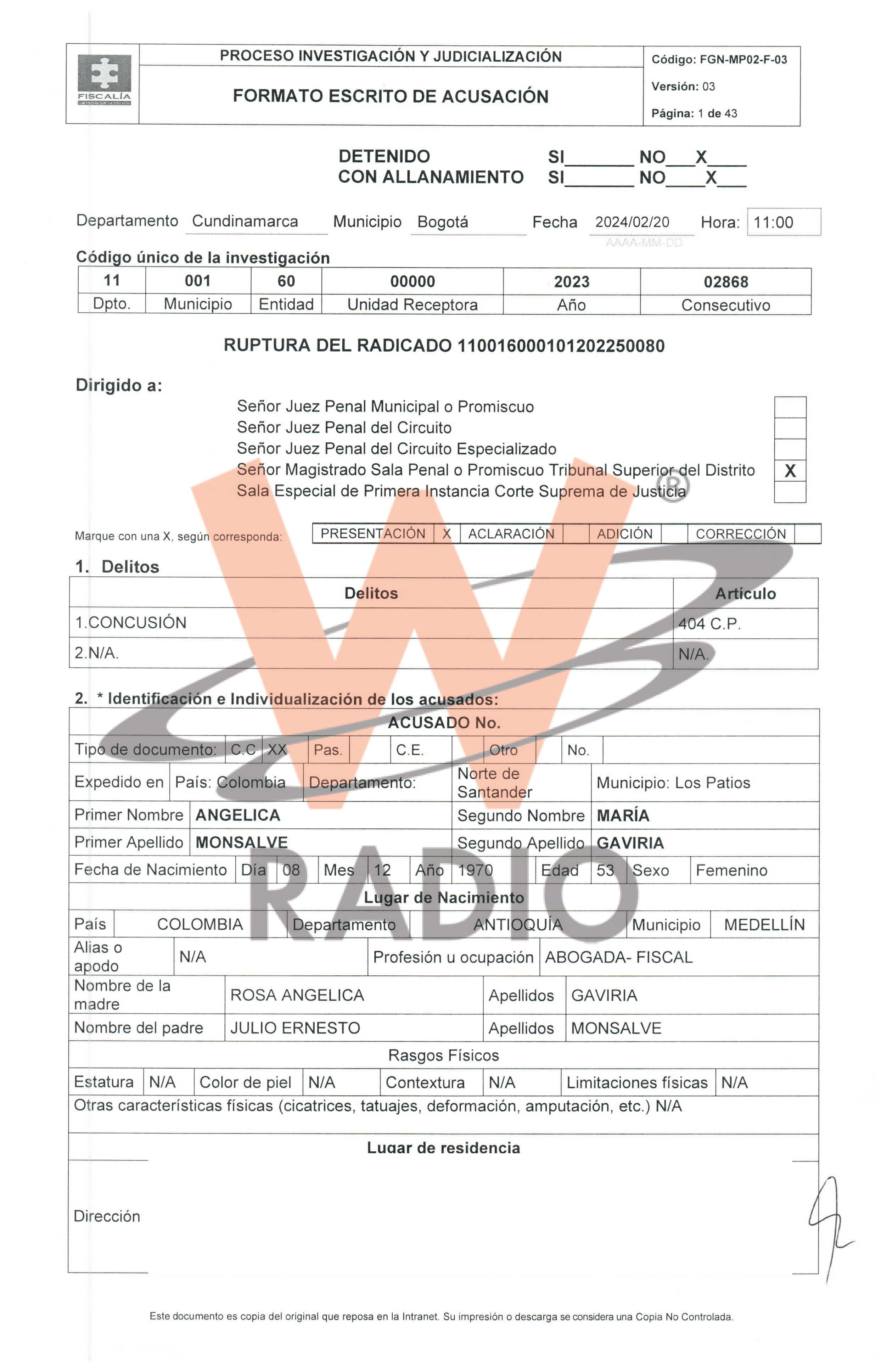 Angélica María Monsalve Gaviria presuntamente cometió el delito de Prevaricato y Fraude Procesal, en agravio de La Administración de Justicia, el Poder Judicial, el Estado de Colombia y Wilson Javier Devia Pérez.