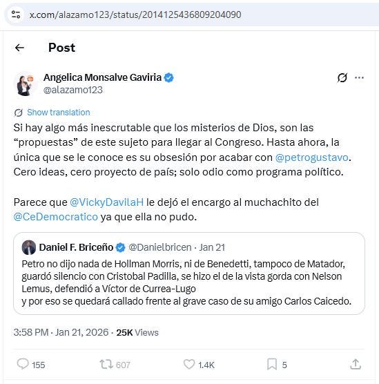 3. Angelica Monsalve citando al Uribista Daniel F. Briceño como ejemplo de anticorrupción