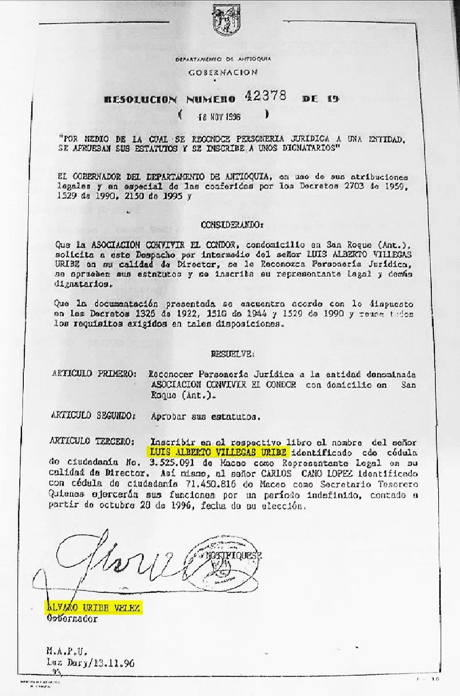 En tercer lugar Uribe como Gobernador de Antioquia le aprobó el 14 de noviembre de 1996 la Convivir el Condor a Luis Alberto Villegas Uribe, fundador de grupos paramilitares en la Hacienda Guacharacas que había sido propiedad de los hermanos Uribe Vélez.