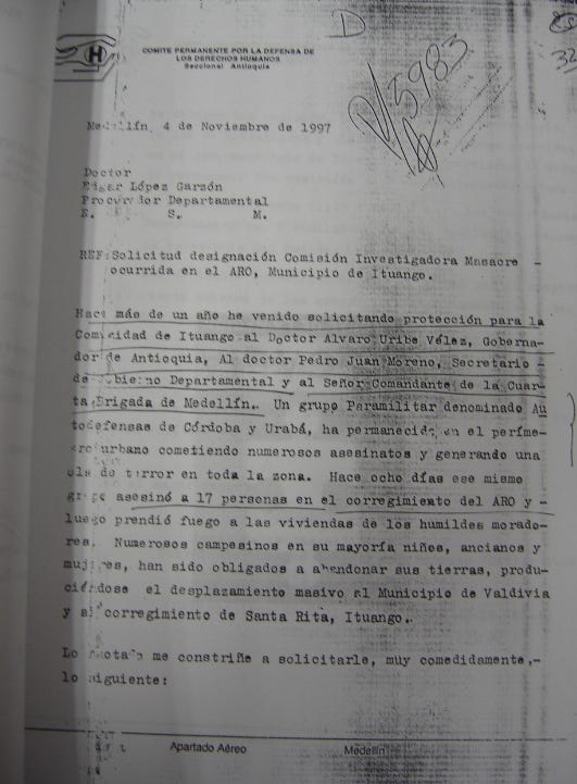 Señalamientos Públicos: Acusó directamente al entonces gobernador Álvaro Uribe Vélez y a altos mandos militares de omisión y complicidad.