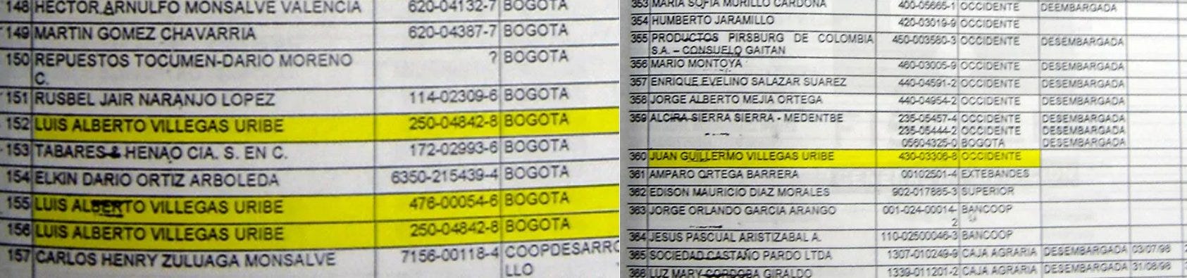En segundo lugar los hermanos Villegas Uribe aparecen como titulares de cuentas bancarias que financiaban grupos paramilitares en Antioquia según el proceso 34986 de la Fiscalía General de la Nación donde se descubrieron las finanzas de las autodefensas en todo el país.