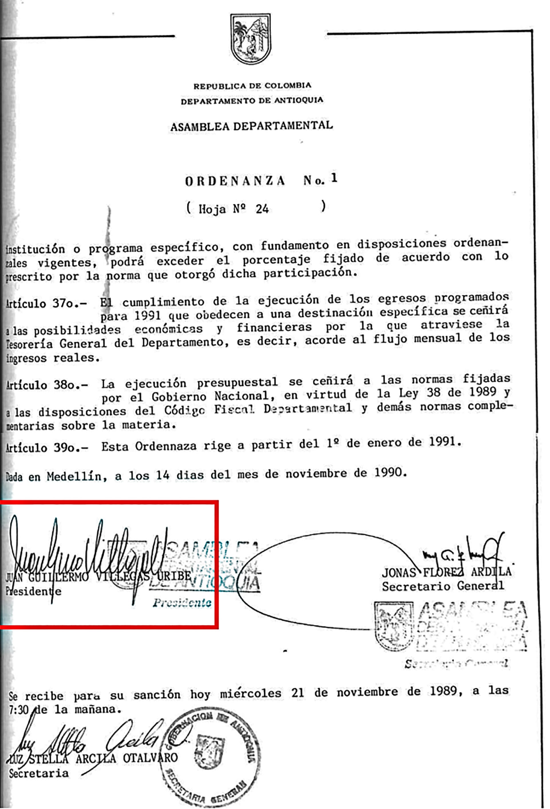 Juan Guillermo Villegas Uribe fue presidente de la Asamblea de Antioquia durante 1990, teniendo gran poder sobre el presupuesto de la Gobernación de Antioquia y las rentas departamentales como lo demuestra esta ordenanza