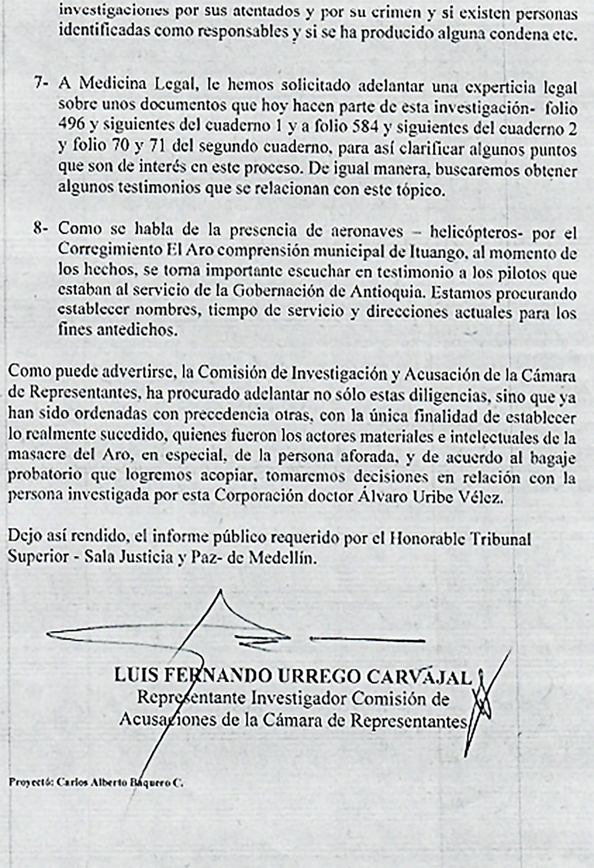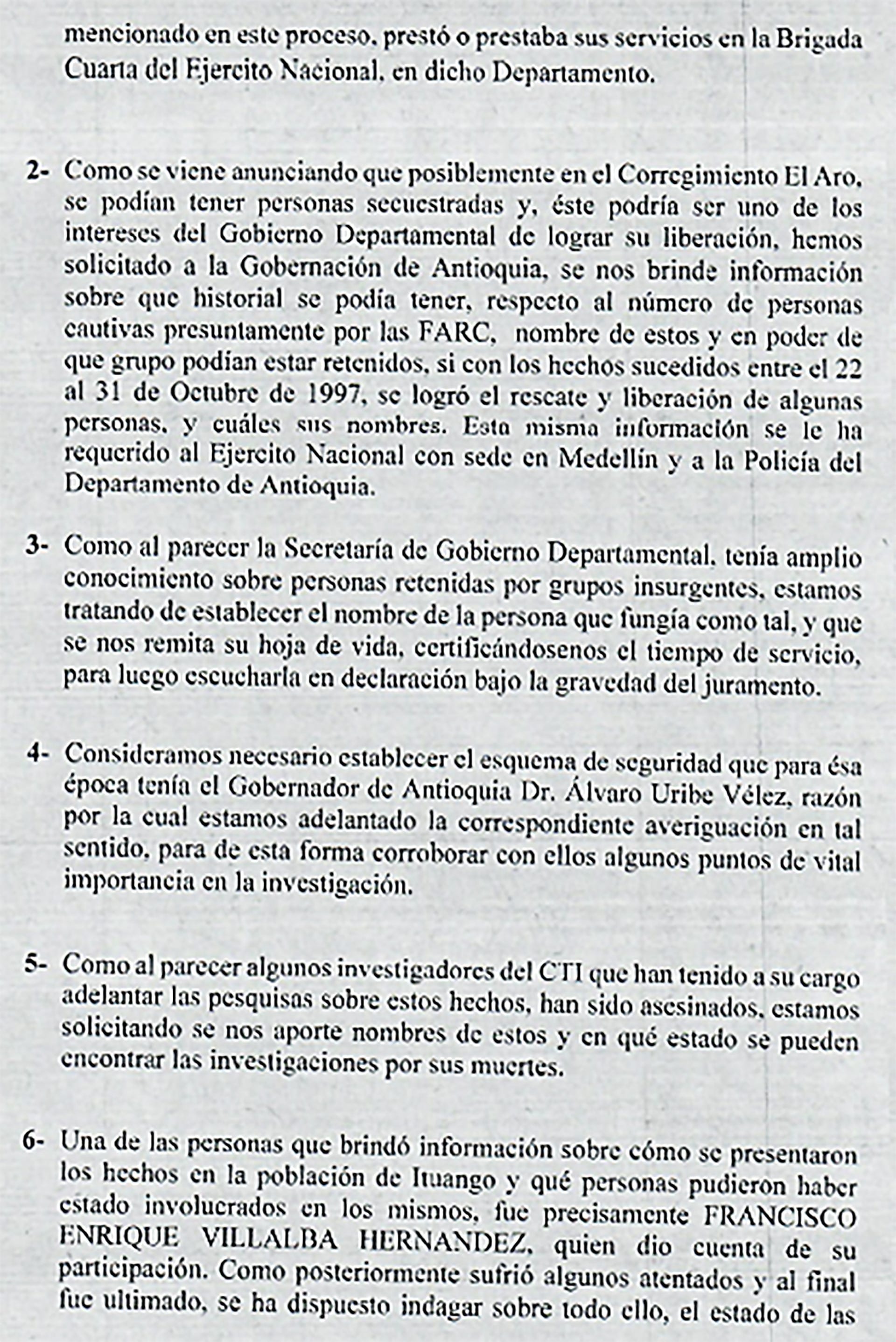 En el siguiente documento de la Comisión de Acusaciones se ordena investigar el esquema de seguridad de Álvaro Uribe Vélez cuando era Gobernador, las muertes de miembros del CTI que investigaron la masacre del Aro y el asesinato de Francisco Villalba que declaró en el proceso legal.