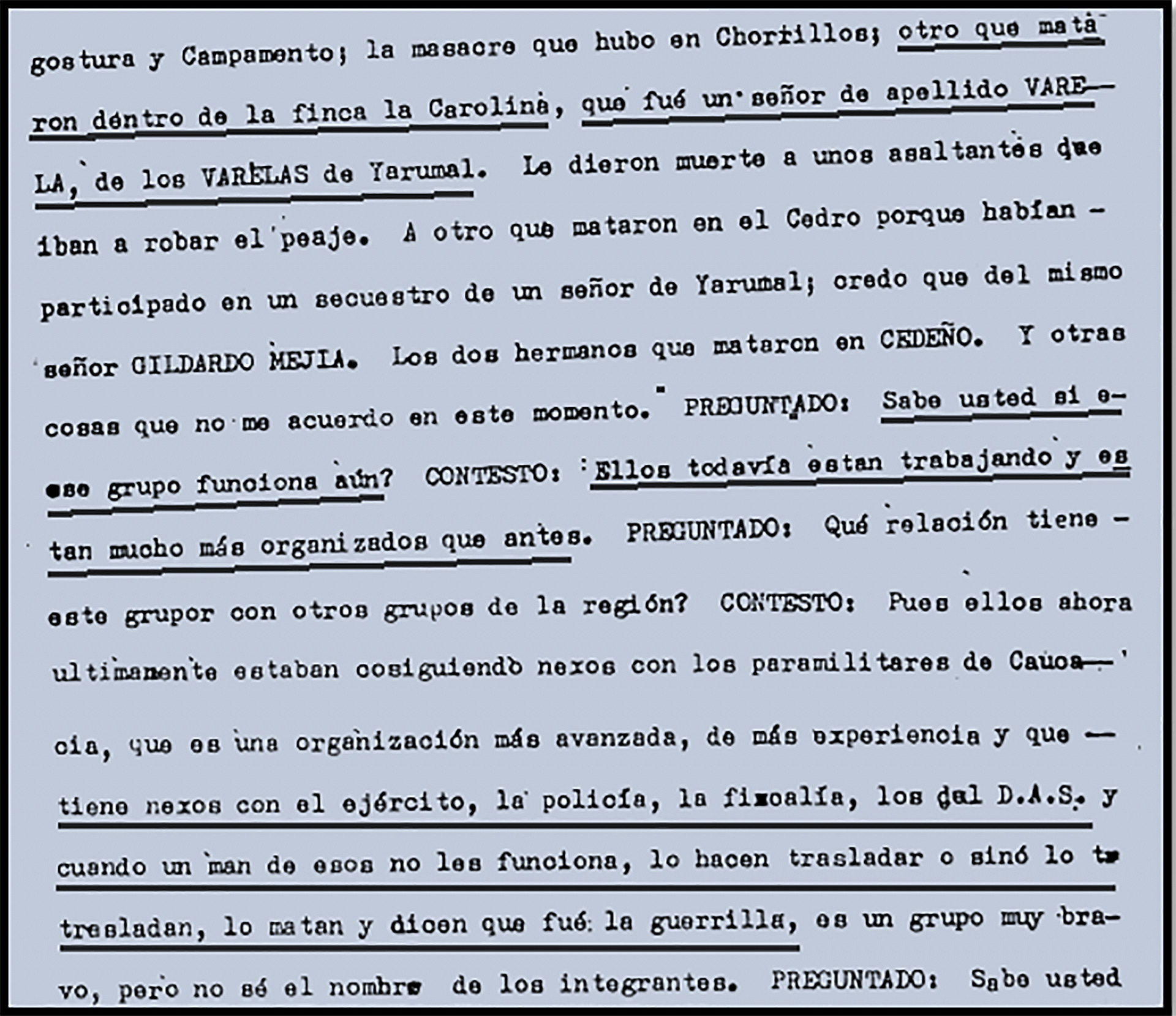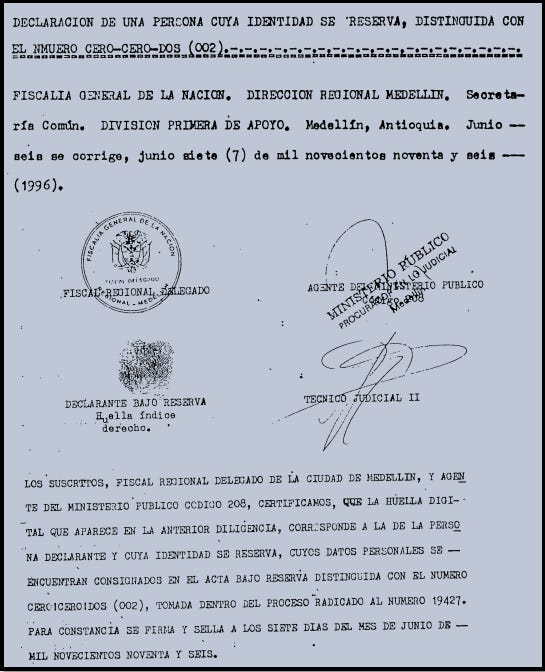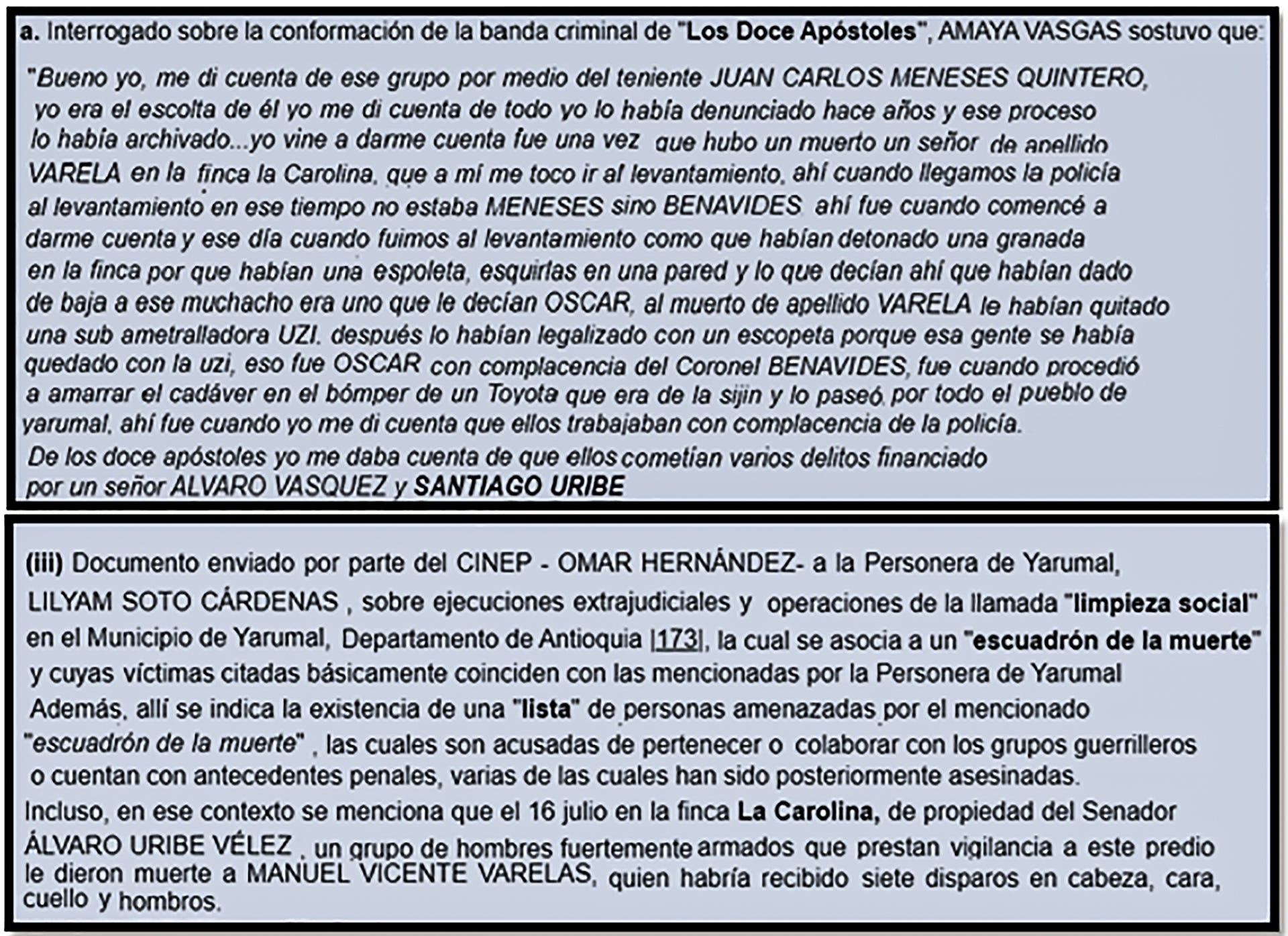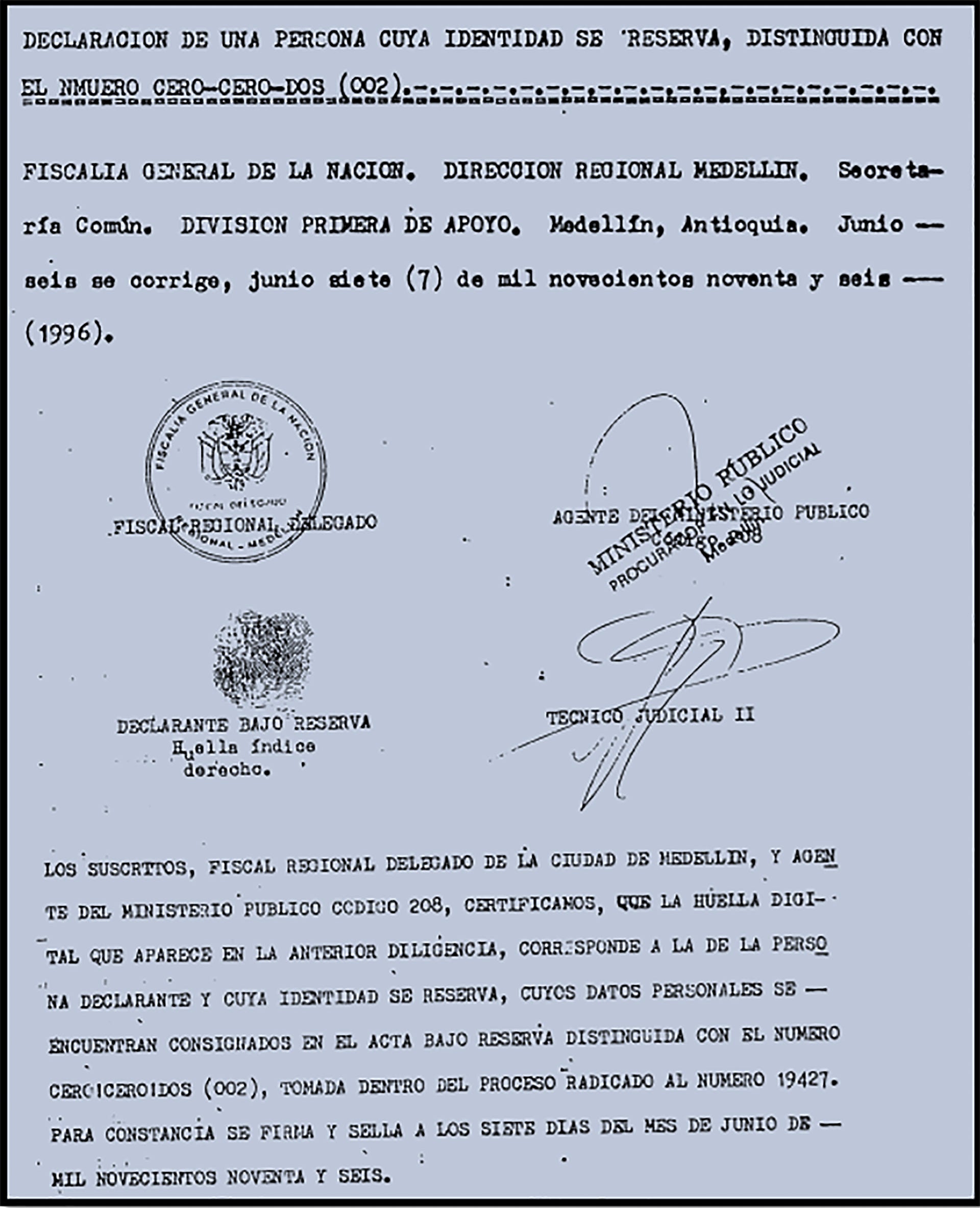 Una declaración que hay desde los 90s contra los “Doce Apósteles”, no solo los responsabiliza del homicidio de Vicente Varelas por el que se acusa a Santiago Uribe, sino de asesinatos de las FFMM y la Fiscalía. El testigo se identificaba solo con su huella para no ser asesinado.
