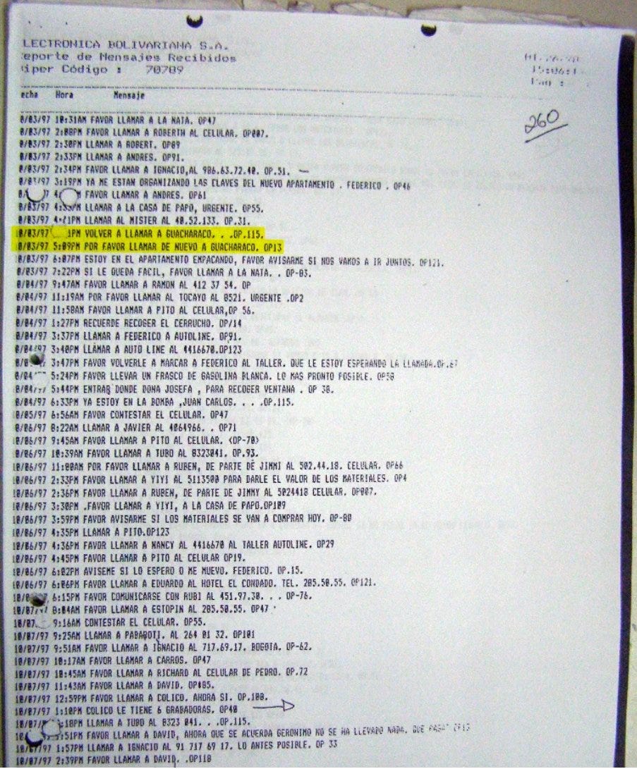 En cuarto lugar Juan Guillermo Monsalve, “alias guacharaco”, si era un miembro de los grupos paramilitares, así lo prueba un mensaje de beeper del 10 de marzo de 1997 donde aparece como miembro de los grupos de autodefensa.