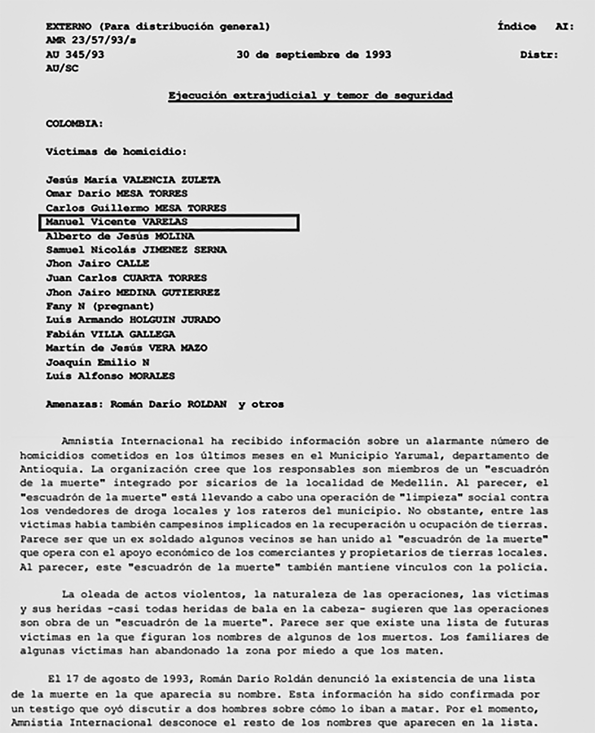 En este documento de Amnistía Internacional del 30 de septiembre de 1993 se señala a Manuel Vicente Varela de haber sido víctima de una ejecución extrajudicial o falso positivo. En la lista hay otras víctimas de los paramilitares de los Doce Apóstoles en Yarumal.