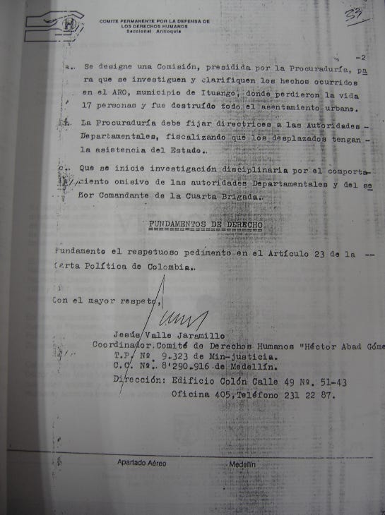 Jesús María Valle invocando el artículo 23 de la Constitución Política de Colombia sobre el derecho fundamental de petición, denunció el 4 de noviembre de 1997 a Álvaro Uribe Vélez, exgobernador de Antioquia, Pedro Juan Moreno, secretario de gobierno departamental y al señor comandante de la cuarta brigada de Medellín ante el Procurador Departamental Edgar López Garzón por no proteger a la población del municipio de Ituango, en especial del Aro. Allí pidió una comisión conformada por la procuraduría y una investigación disciplinaria contra la Gobernación por la masacre del Aro. Esta denuncia le costó la vida.