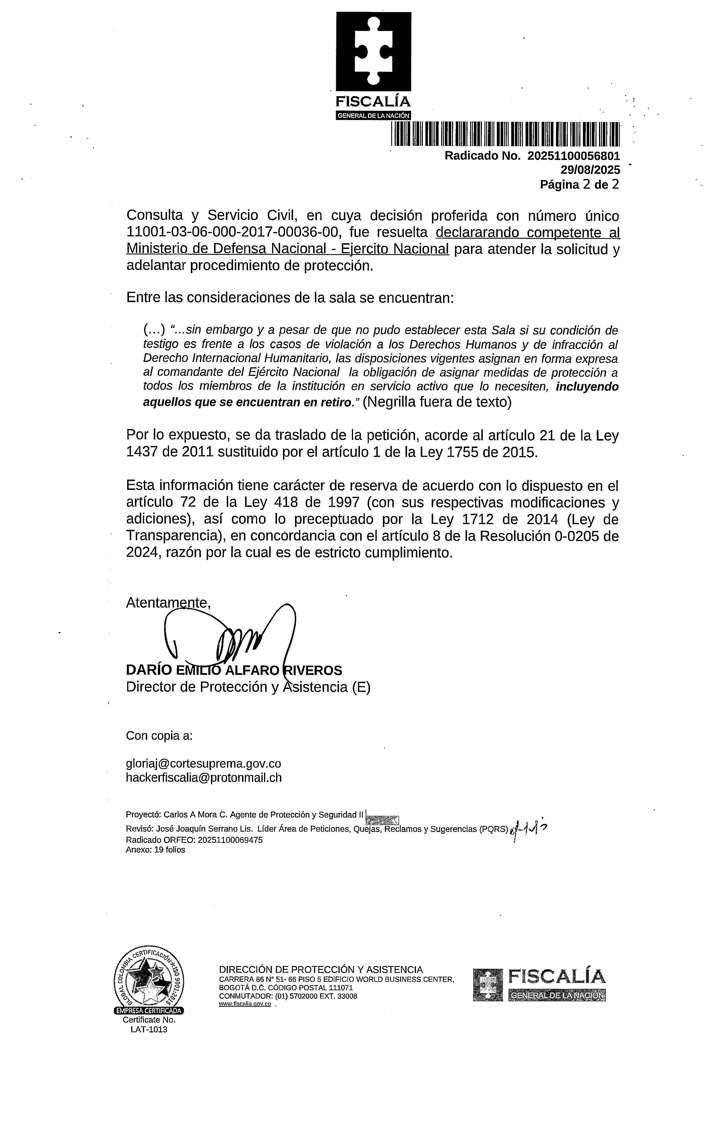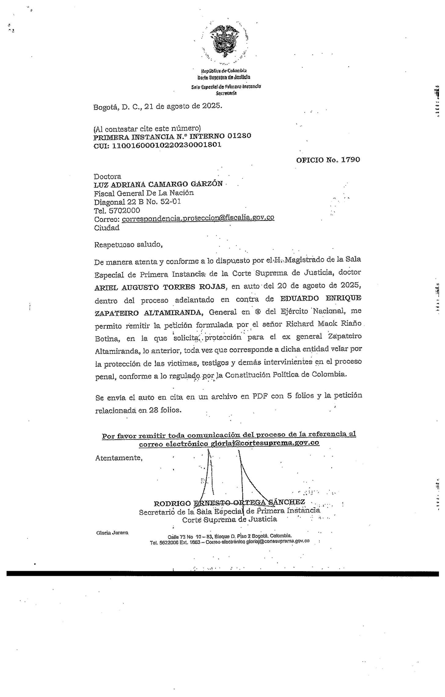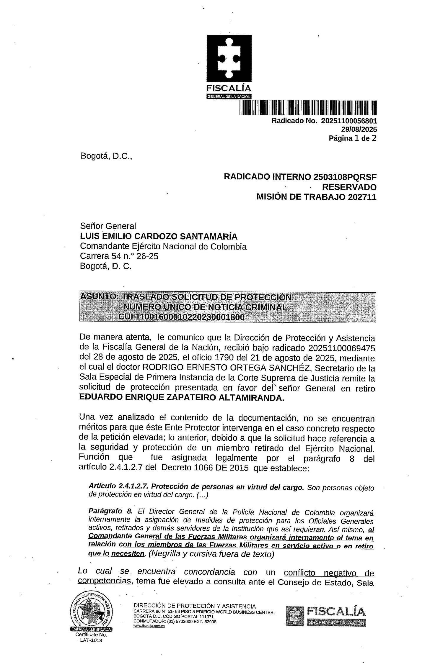 ZAPATEIRO TIENE ESQUEMA DE SEGURIDAD DEL MINISTERIO NACIONAL - EJERCITO Y NO NECESITA ESQUEMA DE LA FISCALIA.
